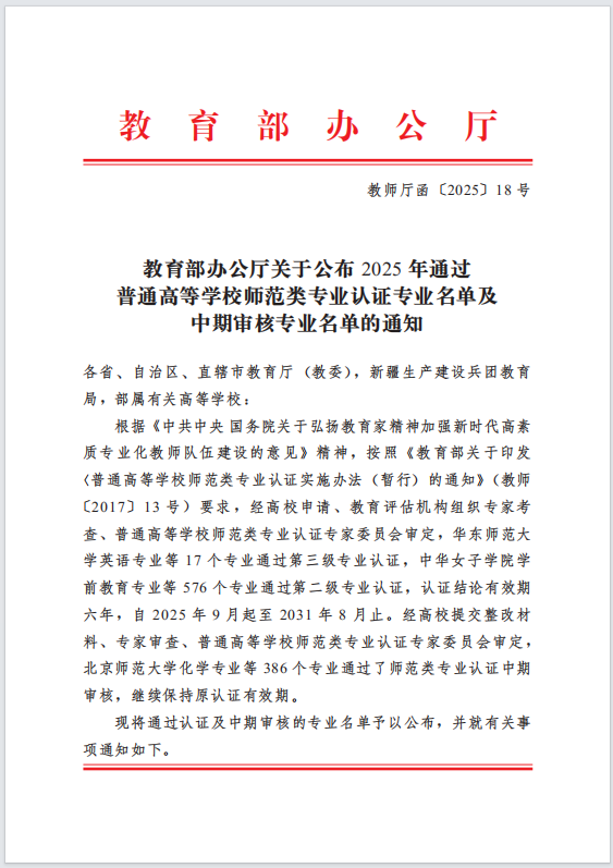 近日,教育部办公厅发布《关于公布2025年通过普通高等学校 师范类专业认证专业名单及中期审核专业名单的通知》(教师厅函〔2025〕18号)。我校数学与应用数专业通过了师范类专业二级认证中期审核,继续保持原认证有效期。(有效期六年,自2022年7月起至2028年6月)